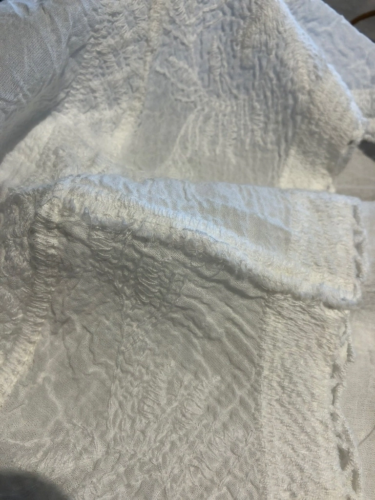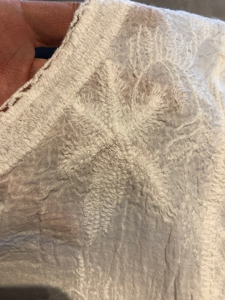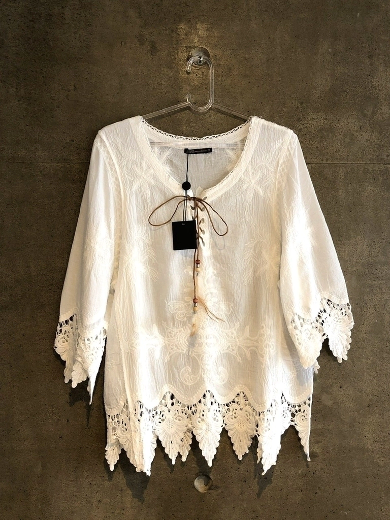 Blusa em tecido de algodão rugoso, bordado, com barrado em renda no punho e na barra, decote V com amarração. Tecido é delicado e têm transparência. Arremates da costura visíveis do lado exterior.