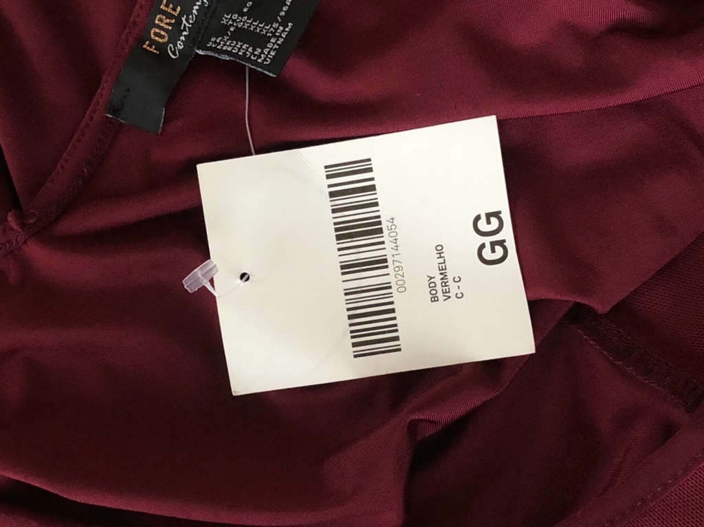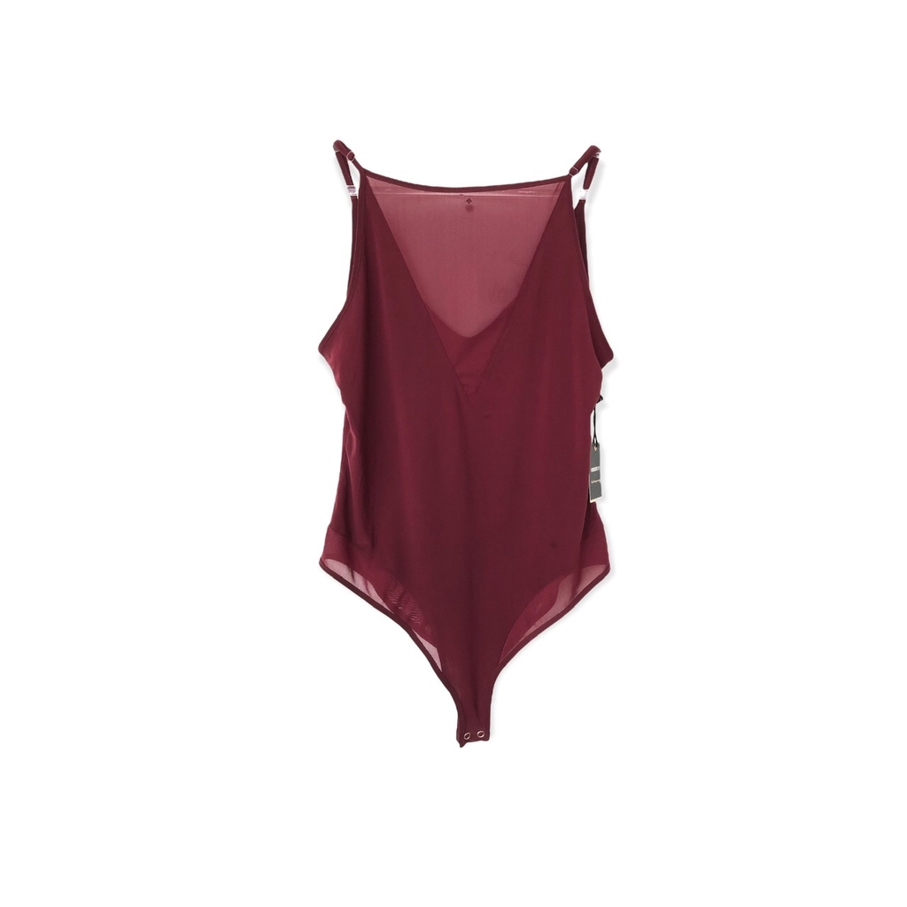 Body em tecido liso na cor vinho escuro; tem detalhes em tecido transparente no colo e nas laterais do quadril